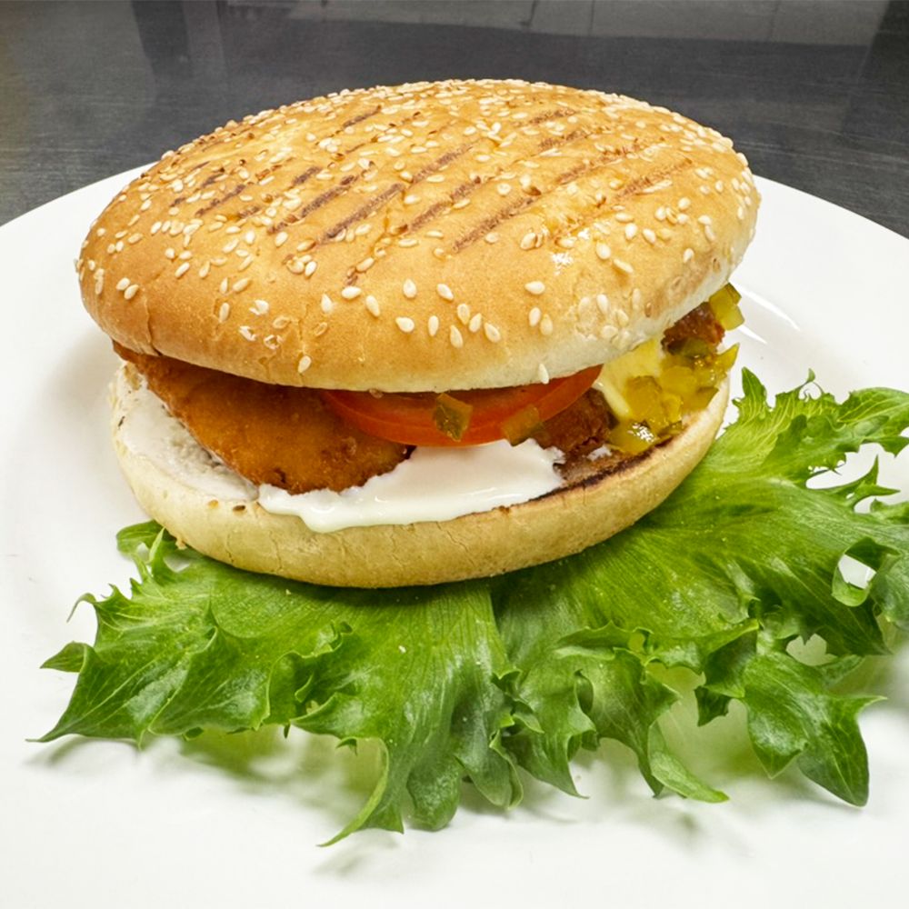 Hamburgerisai, paneeritud kanafilee ribad, küüslaugu kaste, juust, tomat, kurgisalat